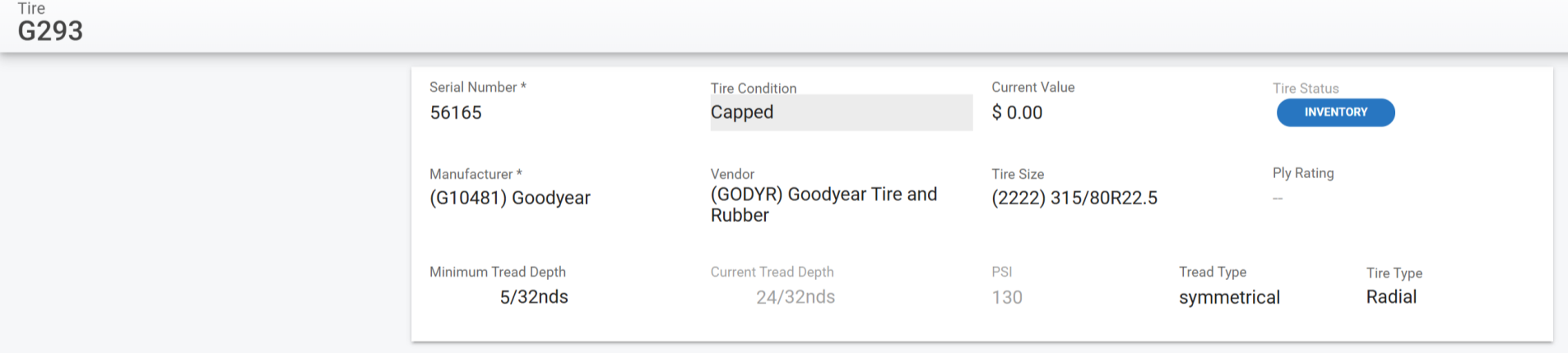 The primary information panel that is visible after selecting a tire in the Tires list shows all of the primary information for the tire record. This article will focus on the fields contained within the primary panel.